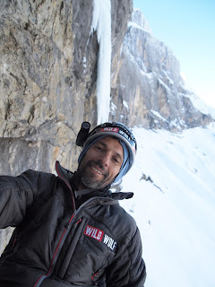 Al dia siguiente la mañana es fria, es hora que el fogoncillo empieze a trabajar, nos hacemos los remolones y aguantamos en el saco hasta ultima hora, estendemos las cuerdas, preparamos el material de roca con unos cuantos tornillos y a la faena, el primer seguro que es el mejor, es un spit, ¡¡¡esto promete!!!! llegar hasta el ya me costo quitarme los guantes y sentir la fria roca a estas alturas, lo siguiente, si puedes clavar... que lo mas seguro que no!!! te marcas un dry hasta una universal, metes un par de clavitos y pinchas en el estrecho hielo desplomaoo, hasta que llegas a la trave, aqui se te van todas las tonterias, 15m de travesia ascendente que la flipas, muy muy bueno!!!!! REUNION!!!!!!!!